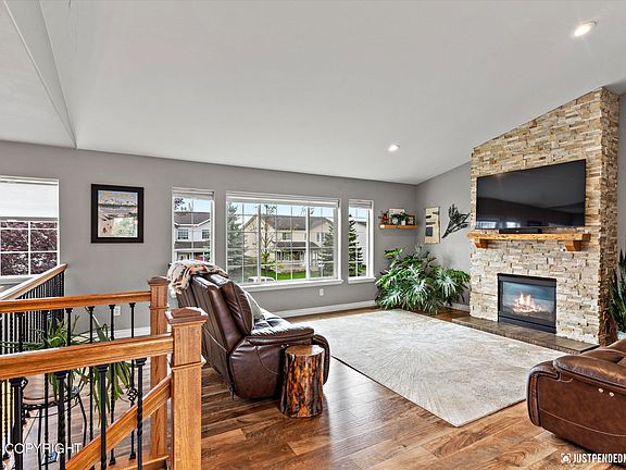 Fully updated Southport Home w/incredible Chugach mountain views! Open living layout w/vaulted ceilings & gas FP w/custom stack stone surround and live edge mantel. Kitchen has custom soft close cabinetry w/granite counters, double oven, custom hood, and under cabinet lighting. Walkout access to fenced yard from upstairs & downstairs! Backs to greenbelt. Trex decking. Shed w/electrical.New top down, bottom up honeycomb blinds throughout and blackout blinds in the bedrooms. Bathrooms have granite countertop vanities with soft closing cabinets. Upstairs walk-in shower has marble tile, river rock floor, and sliding glass door. Downstairs tub has subway tile and sliding glass door. Custom wood and metal railing in entry. Bottom window seals were replaced with solid surface. Custom trim and LVP throughout. Durable cut pile carpet on tops of stairs and bedrooms - professionally cleaned 8/15/24. Raised gardening beds and raspberry bushes on the back fence. The list of updates goes on! Do not miss out on this beauty!