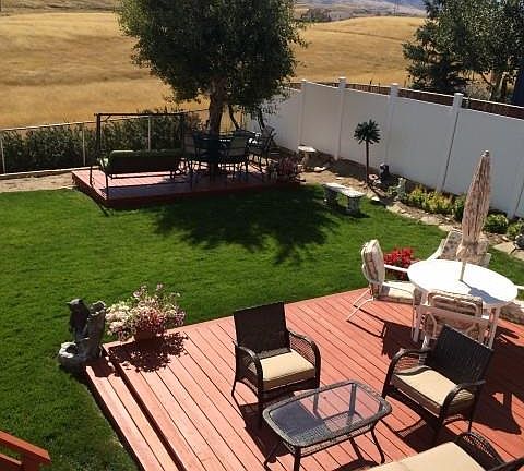 Wow what a view! Enjoy the mountain views from many room in the home or from the multiple back yard sitting areas surrounded by lush lawn, flowers and remote controlled fountains. There's room to roam with two living spaces, two bedrooms up, and a large master suite with double closets downstairs. A large garage and shed makes tool storage easy.