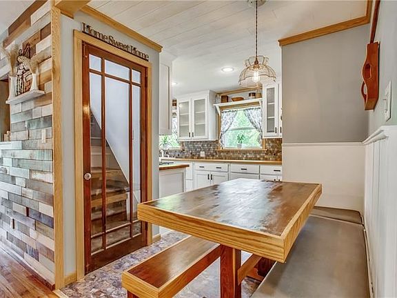 Completely updated and meticulously maintained 2 bedroom ranch situated on a serene, park-like lot. This home is full of accents that make it unique and beautiful including a wooden plank accent wall in the living room, gorgeous stone hearth around the wood burning stove fireplace, and an updated kitchen with wood countertops, stone backsplash and frosted glass cabinetry. Hardwood floors throughout the living room and bedrooms. Glass pane door leading to a staircase up to an attic, ready and waiting to be finished into a possible 3rd bedroom or other functional living space. The sliding glass door leads out to a private, covered patio space to entertain and enjoy the outdoors. Behind the home, a mostly flat, sprawling green space, part of which is fully fenced in. And beyond the fence, it expands even further and has a barn large enough to accommodate a vehicle. Welcome home.