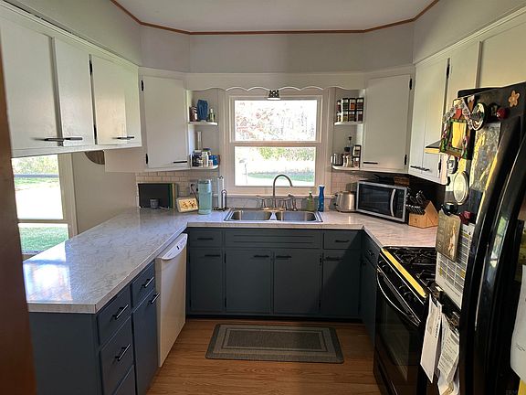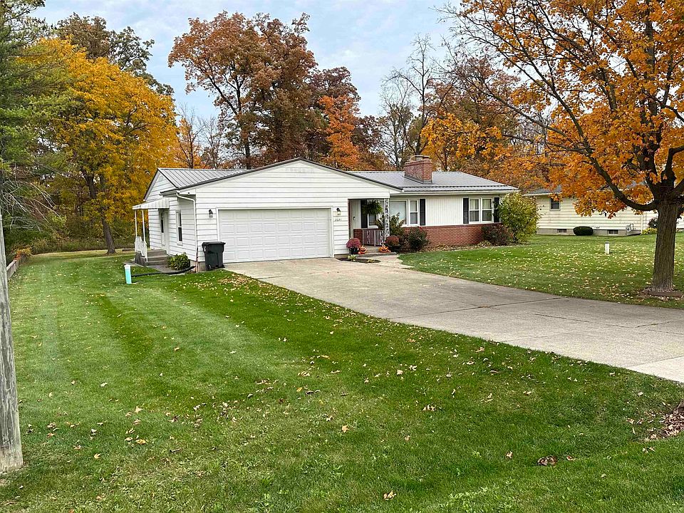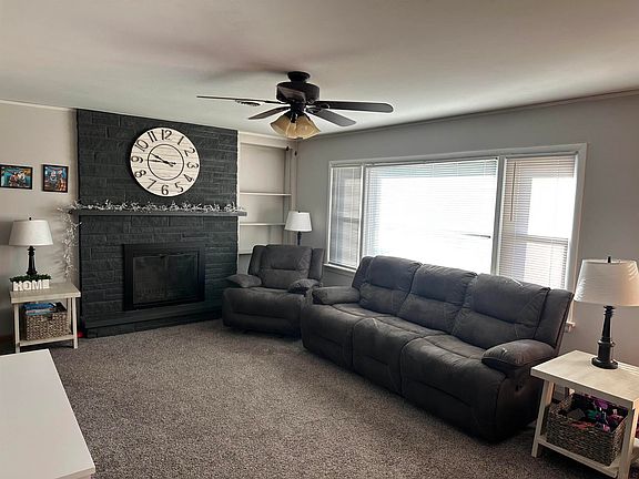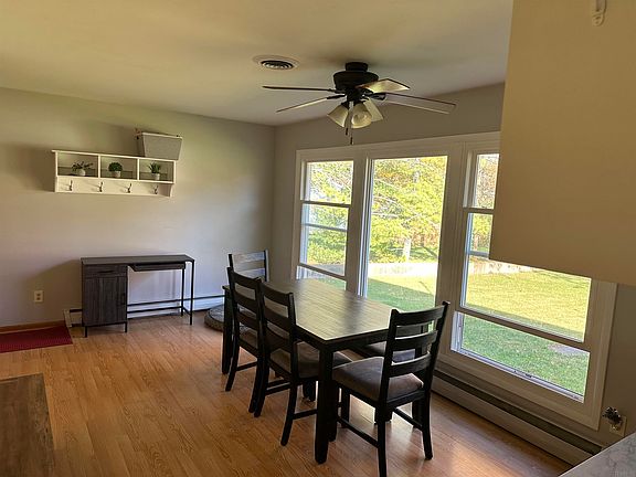 Great country setting on big lot close to town. Epoxy floor installed in garage 2023. New Metal Roof, New Windows, New Boiler in 2020. New AC 2014 and new living room carpet 2018. This home features a usable and flexible floorplan. The large living room has a stone fireplace and built in bookshelves. The full basement is a huge plus with large multi purpose room with brick fireplace, laundry, shower, sink, storage and extra usable room. There is a two car attached garage and a detached garage with concrete floor at the rear of property.