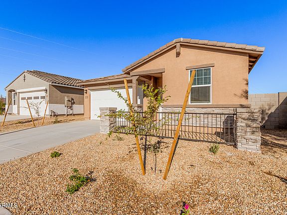 The search is finally over! This newly built home in Desert Moon Estates is ready to move in & enjoy! You'll be welcomed by a 2-car garage, stone accents, & a courtyard. Interior is meticulously designed, paired w/tile flooring, 9ft ceilings, stylish light fixtures, & fresh neutral paint. Harmonious open floor plan maximizes space & provides an excellent flow for entertaining. Impeccable kitchen displays a pantry, plenty of cabinets w/crown moulding, a prep island w/a breakfast bar, granite counters, & SS appliances. Head to the carpeted primary bedroom to find a private bathroom w/dual sinks & a walk-in closet. PLUS! Adding to the gem's functionality are 2nd main bedroom & a bonus room. Spacious backyard w/a covered patio awaits your personal touch & landscape ideas. Act swiftly! This community features a playground, walking trails, tot lot, ramadas and BBQ grills. Residents enjoy floorplans featuring expansive great rooms and flex spaces. Each energy-efficient home comes standard with features that allow you to live better and breathe easier too.