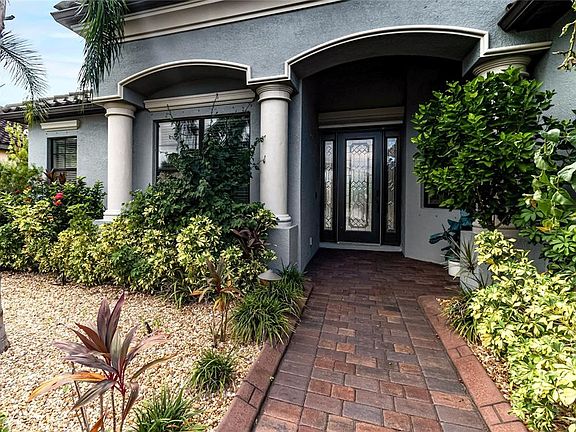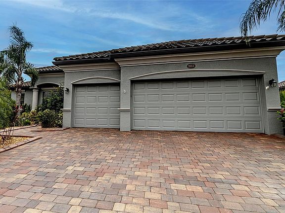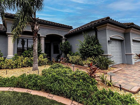 This beautiful pool home is located in the sought after gated community of Gran Paradiso. This 3 bedroom + 1 flex room that can be a 4th bedroom, office, or even game room/craft room, 2.5 bath home 2,365 square feet of living space, also it has a 3 car garage. The ensuite bath includes a double vanity, soaking tub, walk-in shower, linen closet, and spacious walk-in closet. The private screened lanai is the perfect spot to unwind and watch the beautiful sunsets, swim in your private pool, or soak in your private spa. Gran Paradiso is a Tuscan-inspired, resort style community. Gran Paradiso offers amenities that include a full-time activity director, zero-entry pool, tennis and pickleball courts, basketball, sauna, hot tub, playground, clubhouse, walking trails. Even a Gopher tortoise conservation area! Located just minutes from the popular Wellen Park, the Atlanta Braves Stadium, Gulf beaches, shopping, and restaurants, this home is the ideal combination of comfort, luxury, and lifestyle. The community also has lakes and nature preserves and it's only about 10 minutes from Interstate 75.