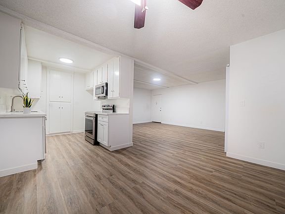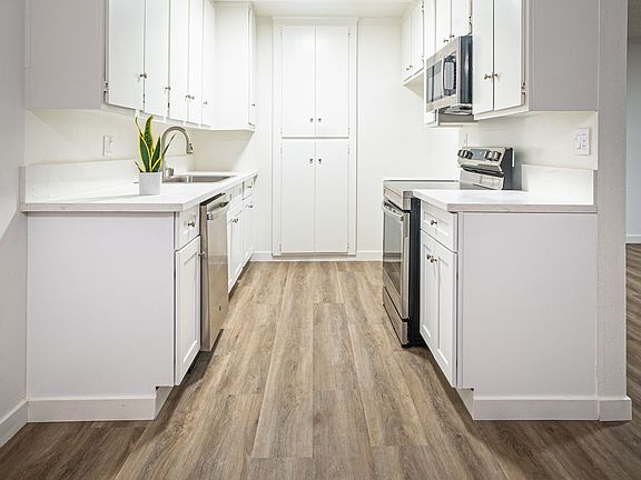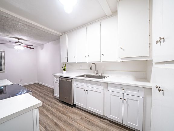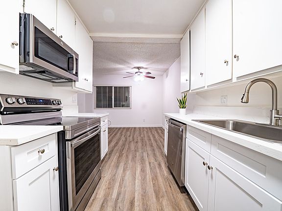 Completely updated with new stainless steel appliances (dishwasher, electric stove/oven, and over-the-range microwave), new countertops, new lower cabinets, new stainless steel sink with tall-spout faucet, new blinds, and modern lighting.