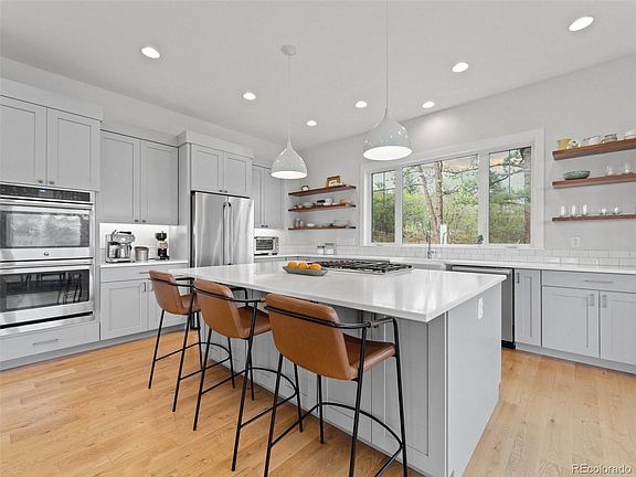 This 5 bedroom | 3 bathroom home reads like new construction and offers absolutely stunning mountain, Sleeping Giant, and Castle Rock views, an invitingly clean aesthetic, and a coveted urban vibe. Built in 2016 and located in the highly sought after Escavera neighborhood, this singular retreat features an open concept family room and kitchen, expansive deck, main floor owner’s suite, newly built workout room, fully installed and paid for $46K solar package that conveys with the home, 4-car garage including tandem space, and ample natural light! The main level offers a family room|kitchen combo with 2-sided fireplace leading to the large exterior deck with huge mountain views. The eat-in kitchen includes GE Café, Miele, and Wolf appliances, walk-in pantry, and custom cabinets. Also located on the main level, the primary bedroom includes sliding door access to the deck with incredible views from two vantage points. The primary en suite bathroom offers radiant heated floors, quartz counters, a huge shower, and an oversized walk-in closet with custom built-ins. Finishing the main level are another bedroom, full bathroom, and laundry room. The lower level includes a large recreation room with gas fireplace and built-in wet bar, three additional bedrooms with mountain views, and a full bathroom. Rounding out the lower level are a 4-car garage with additional lift space and polyaspartic-sealed floor, and newly built temperature-controlled workout room with upgraded flooring. Outside you’ll find a recently terraced yard with additional landscaping, turf play area with retaining wall, and additional play space under the deck. Whole house instant hot water system, water softener, filtration system, whole house humidifier, leak detection system, and zoned HVAC. Hand trowel wall finish, wood floors, solid core doors and upgraded trim. With an efficient plan and ample room to entertain family and friends, this beautiful home the perfect place for gathering and celebrating!