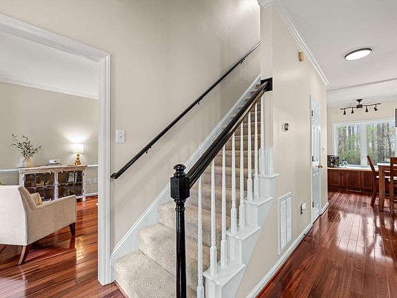 Charming 4-Bedroom Home on Private Wooded Cul-de-Sac Lot! Nestled on a serene .69-acre wooded lot in a quiet cul-de-sac, this beautifully updated 4-bedroom, 2.1-bath home offers privacy, charm, and modern convenience. From the inviting front porch to the wood deck perfect for entertaining, this home is designed for both relaxation and gathering. Inside, the first floor showcases stunning Brazilian Cherry Hardwood floors, a spacious front-to-back family room with a cozy gas log fireplace, and a formal dining room turned into a functional home office. The updated kitchen boasts new quartz countertops, a stylish backsplash, a farm-style sink with a new faucet, a new dishwasher and refrigerator, and custom cabinetry—a dream for any home chef. New light fixtures in the kitchen and dining room add warmth and elegance. Upstairs, you'll find brand-new carpeting throughout, along with a vaulted ceiling in the primary bedroom for an airy, spacious feel. The primary bath features new light fixtures, and the 2nd-floor laundry is thoughtfully equipped with a custom-built folding shelf. Additional highlights include a two-car attached garage with custom-built storage shelves and a corner workbench, a video doorbell, and fresh exterior and interior paint following a professional power wash. Home is located only minutes to COSTCO, 2 grocery stores including a Harris Teeter and other conveniences that include restaurants, Walgreens and 3 different gas stations. Wake-Tech and I-540 are also very close by. Move-in ready and designed for both comfort and style, this home is a must-see!