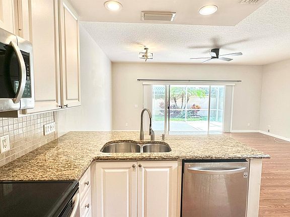 Exceptional value for a 3 bedroom home in the desirable community of RiverWalk! This end unit townhome is completely private with a lovely garden view and screened covered patio. There is laminate flooring on the ground level and carpet upstairs. The kitchen has granite counters and stainless appliances. The primary bedrooms is very large and has a generous walk in closet, en suite bathroom with double sinks and large walk in shower. The guest bedrooms share a good sized bathroom with bath/shower combo. Included in the rent is Xfinity internet and cable service, full use of all amenities - pools, gym, tennis etc. lawn care is also included. The home comes with a central vacuum system and central alarm system. Pet friendly!