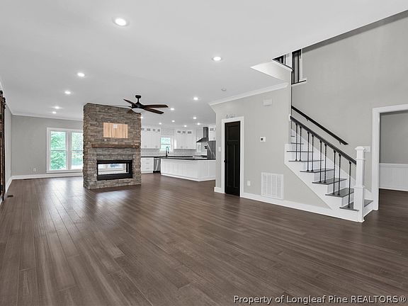 ***SELLERS TO GIVE $4000 TOWARDS BUYER CLOSING COST*** Beautiful Waterfront Property with stunning view lake, 4 bedrooms 2 1/2 baths. Completely renovated ground floor with gourmet kitchen soft close cabinets, brand new ZLine gourmet gas stove/oven 5'x10' island with huge amounts of storage, custom built coffee bar with drink fridges and sink, double-sided custom built stone gas fireplace. Bamboo hardwood throughout the ground floor, stairs and upstairs landing. Brand new carpet in all 4 bedrooms large master bedroom, jetted tub, sep shower, double vanity, deck, fence on front and side of backyard on lake. Walk-in crawlspace encapsulated and dehumidified. Jack Britt Schools no city taxes. Close shopping and Post.