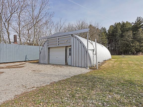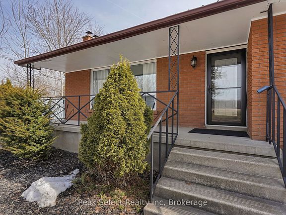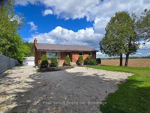 Cute little bungalow that is a PRIVATE rural property with farm field on one side, and high fence on other side and just trees at rear. The GARAGE is about 25 x 40 ft estimate with concrete floor, hydro and single garage door but likely fit two cars in tandem! The little, country, cozy brick, one floor home is on just right, not too big, lot, private and short drive to City/Shopping/Saturday market. >>>Plus, some of the expensive updates are done: 2023 drilled WELL; most WINDOWS, updated KITCHEN, bathroom, METAL roof, exterior doors, some flooring 2024. Appliances are newer too! Bring the RV, Boat, trailer or truck home since lots of parking for all. This home has the covered front porch to welcoming updated flooring in living room with wood burning fireplace (as-is); open to dining area, then updated kitchen with cabinets & appliances and off the kitchen is convenient door to deck & rear yard. THREE bedrooms on the main. Four piece, updated bathroom with glass shower doors. The lower level has family room with bar & fridge; plus 2 piece bathroom that is off unfinished room with its 2 windows-could be a den/ potentially a 4th bedroom. Utility area with storage plus large cold cellar for tons of storage. Great UPDATES (approx dates): 2023 New Drilled well; Well equipment 2019; 2024 Living room flooring; 2022 most new windows on main; 2022 renovated kitchen; 2021 updated main bathroom including Bathfitter tub/shower; and in previous years - METAL roof; front & rear door. In right season enjoy the Lilac, pear and other trees in spacious lawn with no views of neighbours -crops to one side; high privacy fence to other side; farm pasture, with view of cattle, across the road ,and backs onto a treed area behind. Measurements per virtual tour. Dates are approximate. Lot is about 66 x 330 ft - lots of room for 4 legged friends and the gardener. Add your touches and vision to make this your dream country property close to the City. Shorter close is preferred.
