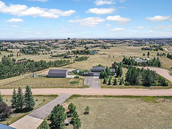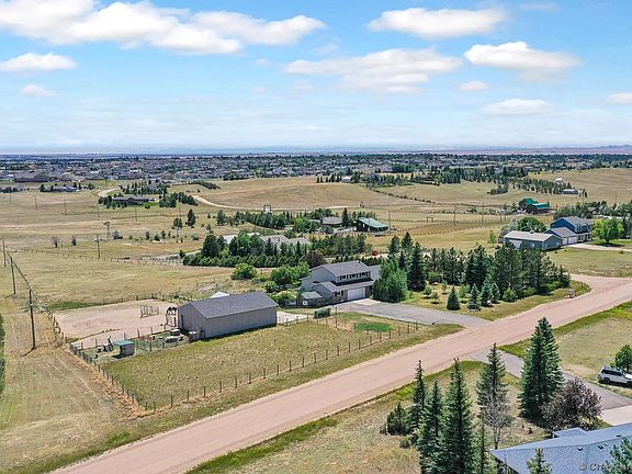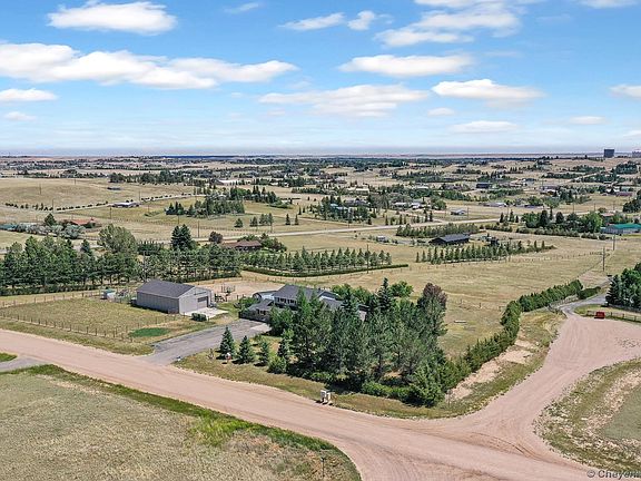 Welcome to your dream home, a magnificent 3-bedroom, 3-bathroom estate just north of Cheyenne. Nestled in a serene and picturesque setting, this estate features three spacious and beautifully appointed bedrooms, each with closets that include built ins. The oversized 2-car garage provides additional storage, ideal for your vehicles and equipment. A grand barn with a 14 ft door, and 100 amp electric service offers versatility and convenience, with a goat run directly connected for ease of use. The greenhouse features multiple raised beds with automated timed irrigation for your gardening delight. The primary bath boasts granite countertops and a sumptuous jetted tub for ultimate relaxation, while the flooring throughout the home includes exquisite engineered wood on the upper level, luxurious hardwood on the main level, and custom tiling in the entryway and upper hall bathroom. The gourmet kitchen is a chef's dream with quartz countertops, hickory cabinets, and a spacious bar with seating for four, perfect for entertaining. Step outside to the Trex deck off the kitchen, complete with an awning sail shade, ideal for alfresco dining and unwinding amidst nature's beauty. The sunroom, located on the lower level, features low e windows and a cozy gas fireplace, providing year-round enjoyment. In the family room, a pellet stove with an auxiliary port for battery backup ensures use even during power outages. The generously sized laundry room on the lower level offers ample storage, and the basement includes a dry bar and extensive built-in storage shelves. The well system is equipped with double pressure tanks for superior reliability. The front pasture is fenced and cross-fenced, with the backyard adorned with an abundance of fruit-producing plants including strawberries, horseradish, rhubarb, asparagus, elderberries, mint, chives, parsley, apples, raspberries, currants, and plums. This meticulously maintained estate offers an unparalleled blend of contemporary amenities and rustic charm. Whether you seek space for hobbies, agricultural pursuits, or simply to savor the tranquility of country living, this home is your perfect sanctuary.