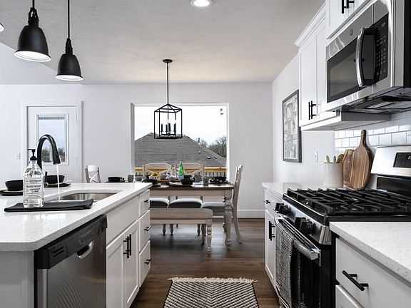 This beautiful new home walk out basement home by Trendsetter Homes features the Chelsee Sowder collection styled by Nest Interiors + Designs and is situated on a large cul de sac lot. This home offers an open floor plan with white painted cabinets, quartz countertops, large center island in the kitchen with walk in pantry, wood floors, two living areas, gas fireplace with shiplap, tiled shower in master bath & tub, deck, patio and full yard irrigation. Trendsetter Homes tech package which includes security monitoring for a year, smart thermostat, keyless entry on front door and video door bell. Sub offers pool tennis and kids play area.