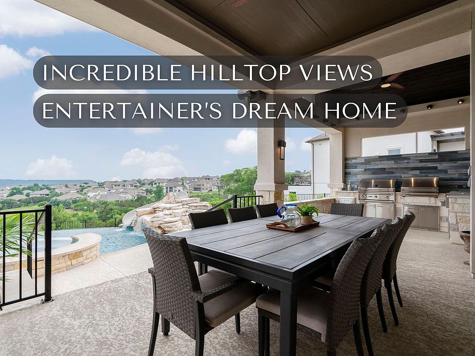 Paradise awaits at this meticulously designed Drees Custom home. Perched atop a hill on an expansive 0.37-acre lot backing to a wooded greenbelt, this home offers an extraordinary living experience inside and out with breathtaking views for miles beyond your backyard oasis. Numerous living and dining spaces offer functionality and impressive designer finishes throughout. The panoramic sliding glass doors seamlessly integrate the indoor and outdoor spaces, guiding you to the outdoor oasis, which features an incredible pool/spa, waterfall, and slide, a built-in kitchen with bar seating, a cozy fireplace, and expansive patio spaces. The manicured landscaping and elegant lighting add to its allure. At the heart of the home, the gourmet kitchen boasts high-end built-in appliances, overlooking a great room with towering ceilings and a modern fireplace. The luxurious primary suite incorporates a private living space, with an opulent ensuite featuring separate vanities, a soaking tub, a walk-in shower with dual shower heads, and a huge dream closet with a custom, built-in storage system. The main-level office, featuring panoramic windows, provides an ideal work environment, while the fourth garage space has been converted into a second office with A/C, a half bath, and a kitchenette. This home includes 2 secondary bedrooms with ensuite baths, a 4th bedroom with two closets, and a 5th bedroom currently suited for a gym with subfloor. The second level offers a lofted game room and a separate media room with a wet bar. The second-floor balcony includes motor shades and a gas fire pit, ensuring an unparalleled outdoor experience upstairs and leaving no detail overlooked. Additional features include an impressive laundry room with cabinetry, sink, and refrigerator space, and a safe room discreetly hidden behind a bookcase door. With $600k+ of interior and exterior upgrades and improvements, this luxury designer home delivers a true Hill Country, unparalleled lifestyle!
