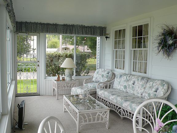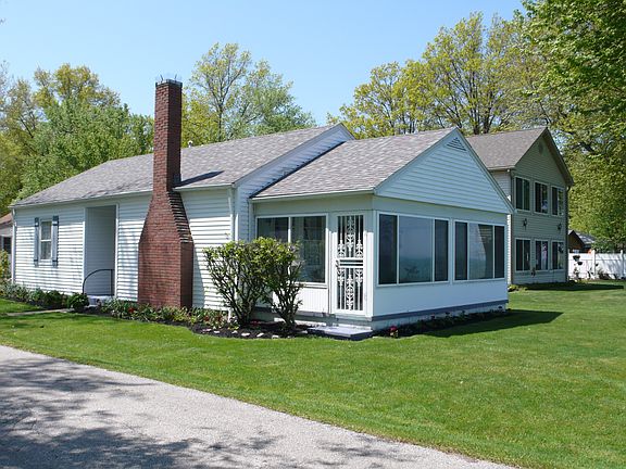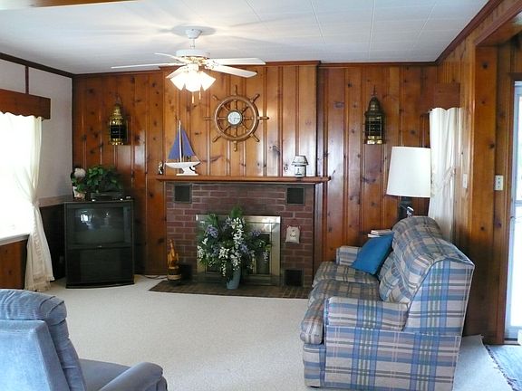 Lowered Price for exceptional good buy - consider reasonable offers. Great vacation home or year around home. Boat club within a mile. This charming house is located at the end of a dead end street with the large enclosed porch/room facing the lake. Has a private beach and erosion controlled. New carpet knotty pine walls in living room, well maintained. Picturesque views of the lake from diningroom, livingroom, kitchen and porch. Spectaulcar sunsets!