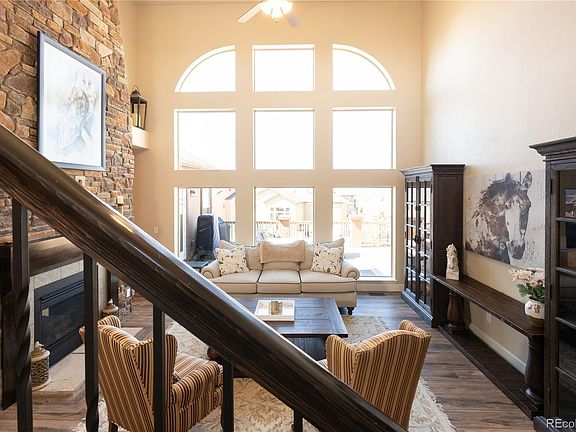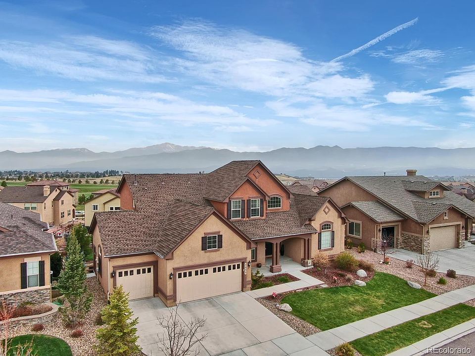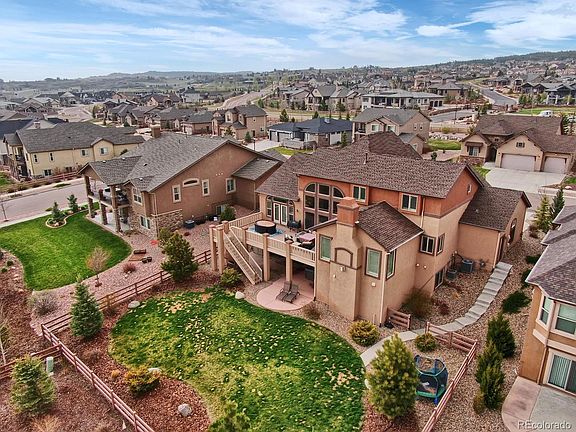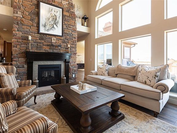Welcome to a captivating, rare-find 2-story home nestled in the heart of Flying Horse in upscale Village of Verona. W/a SW rear exposure, the expansive wall of windows lets in the light & the magnificent Pikes Peak views inside to enjoy. This home is full of striking upgrades/updates + lots of goodies to enjoy everyday life. The immense master suite is a soothing respite from the busy life. The kitchen fireplace is inviting & charming. The deck is sized for either a fun family evening or for entertaining a larger group. The spacious eat-in kitchen w/fireplace was updated w/new granite tops, incl a built-in desk space & adjoins a family room w/a cathedral ceiling & fireplace. The family room walks out to the extended composite deck for more enjoyment. The living room will make anyone pause to appreciate it with a 2-story, floor-to-ceiling stone fireplace & wall of windows bringing in the views. Hand-troweled walls throughout this home w/10' ceilings create a sense of space & elegance. The main level flooring has the look of real wood but w/out the upkeep which has also been installed on the stairs going both up & down. The upper level is a dream w/a loft, 2 BRs & a full bath. The charming loft w/a cathedral ceiling is another place for play or relaxation. The walk-out basement is bright & light making the space very livable. Perfect for entertaining, the custom 10x20' wet bar can house 6 barstools & is adorned w/handsome stone, quartz granite tops & incl a kegerator & wine fridge. W/3 spacious BRs in the basement, the wet bar can also work as a kitchen for a Mother-in-Law suite. Walk outside to a 27x35' patio to enjoy a roomy back yard & a spacious 6-person Jacuzzi hot tub for relaxation. This home is full of closet & storage space. Fireworks from the deck are AMAZING! Overhead Garage Storage ; Custom-Built Security Window Well Covers ; Gas Line for BBQ on Deck ; Plantation Shutters ; Deep Garage Space 25' ; Newer Washer/Dryer ; Newer Refrigerator & Dishwasher