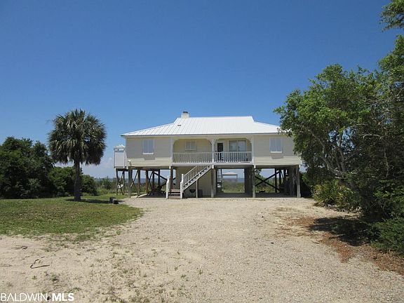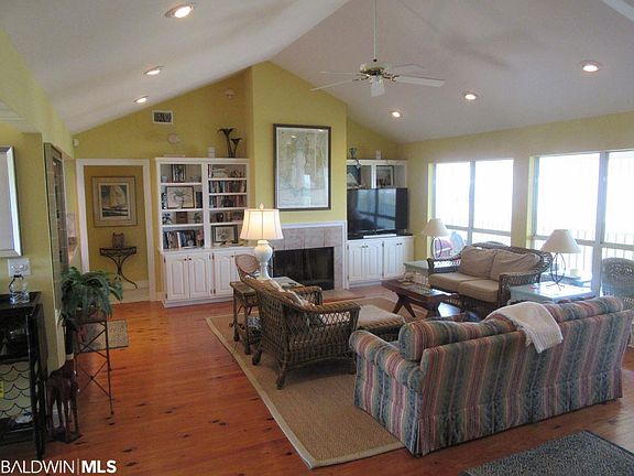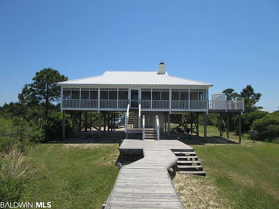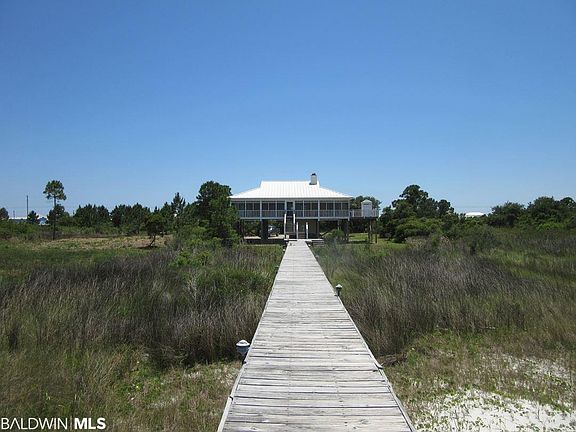 BAY FRONT! Beautiful Bay Front house with large lot 100' x 700'+/- directly off Highway 180 West. Large Open Living/Dining & Kitchen with Eating Bar & Pass Thru with Custom Cabinets and Granite counter tops with Travertine backsplash. Living area has vaulted ceiling with fireplace and built-in bookcases. Living has lots of windows and door opening to large screened porch overlooking Bay. Beautiful Pine Flooring and carpet in bedrooms. Crown Molding. Split floorplan with two guest bedrooms and bath on east side and master suite on west side. Both Master and north guest bedrooms open to bay side decks & screened porch. Back has open deck with shower and screened porch the length of the house. Pier has sunning area, covered gazebo with power and water and at the end sitting/fishing area. Sandy beach. Downstairs storage and large area under house for relaxing and cooking. Hurricane Shutters. Large wooded lot that gives the house privacy. Conveniently located near World Class Golf, Marina, Charter Fishing, Restaurants, Ferry & Historic Fort Morgan.