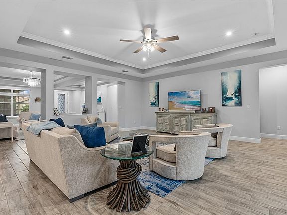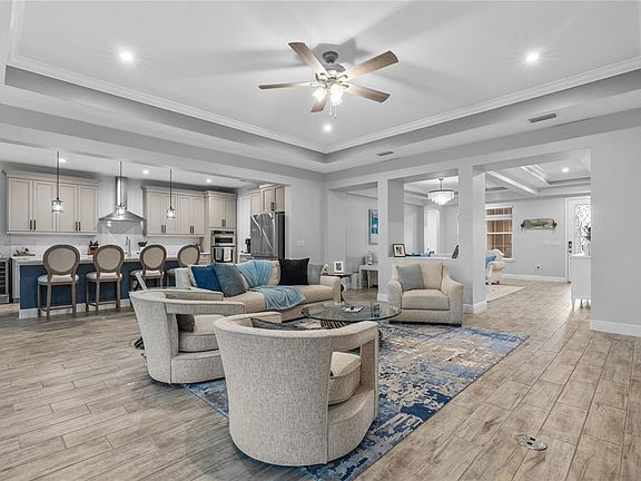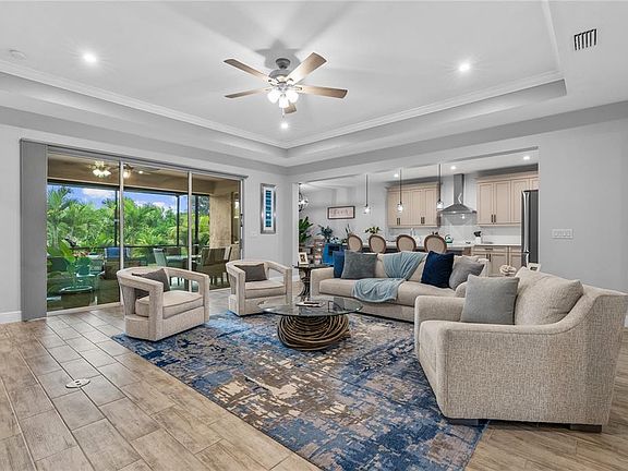 This exceptional and highly upgraded Nantucket II model stands out as one of the finest homes in Renaissance at Wellen Park. Featuring 4 bedrooms, 3 baths, and a 3-car garage, this residence offers a rare multigenerational layout with the ability to create a private in-law or guest suite with its own entrance and garage access. Best of all, this home is located OUTSIDE of a flood zone and DOES NOT require flood insurance. The kitchen has been completely transformed with custom 50" solid maple cabinetry, quartz countertops, a stunning oversized island, and premium appliances including a KitchenAid wall oven/microwave, Samsung Flex-Zone refrigerator (2022), LG 3-tray dishwasher with warranty, Whirlpool cooktop, and a stainless steel vented hood. Woodplank tile flooring runs through all main living areas, complemented by designer tray ceilings with crown molding, neutral upscale finishes, and custom window treatments. The owner's suite and main living spaces exude a refined aesthetic, while the extended screened lanai - pre-plumbed for an outdoor kitchen, offers peaceful outdoor living surrounded by lush tropical landscaping. The homesite accommodates a future pool, providing flexibility to design your ideal backyard retreat. Additional upgrades include $25,000 in storm protection (accordion shutters, automatic lanai screen, and 2023 impact-glass front door), upgraded laundry cabinetry with folding surface, and a Sentricon termite system. Renaissance at Wellen Park offers resort-style amenities including a clubhouse, pickleball, tennis, bocce, playground, direct access to the 33-acre Blue Heron Park, and proximity to downtown Wellen Park, CoolToday Park, golf, shopping, and Gulf beaches. This is a rare opportunity to own a one-of-a-kind home with luxury finishes, thoughtful upgrades, and no flood insurance required.