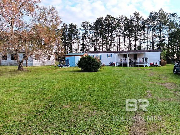 ATTENTION INVESTORS AND CASH BUYERS. Looking for the country lifestyle in a convenient location? This property may fit the bill. Only .7 mile to the Baldwin Beach Express and a total of 7 miles to I-10, it's a great location for anyone needing to commute east to Pensacola or west to Mobile or the Eastern Shore. And since the road is Hwy. 104, it as a direct path to Robertsdale for shopping and other services. Open floor plan for the living room, kitchen and dining room. Enjoy the abundant storage in the kitchen and dining room. Primary bedroom with en-suite off the kitchen, and second bedroom and bath off the hall from the living room. If you want a dishwasher, remove the white drawers that were added next to the range to find the needed hookup. The home is owner occupied. However, it needs a little TLC, so is being sold AS-IS so the buyers can fix it up their way. Includes a large covered from deck. In addition to being on a large lot, a storage shed (16' x 10') conveys. A/C approx. two years old. Stove new in December 2023. The silver refrigerator is available for sale for $1,500; the upright freezer conveys. Some furnishings available purchased separately. (Qualified buyers only to schedule showings.) CASH ONLY. Proof of funds required before showing or preparing an offer. Price has been reduced for a quick closing. Buyer to verify all information during due diligence.