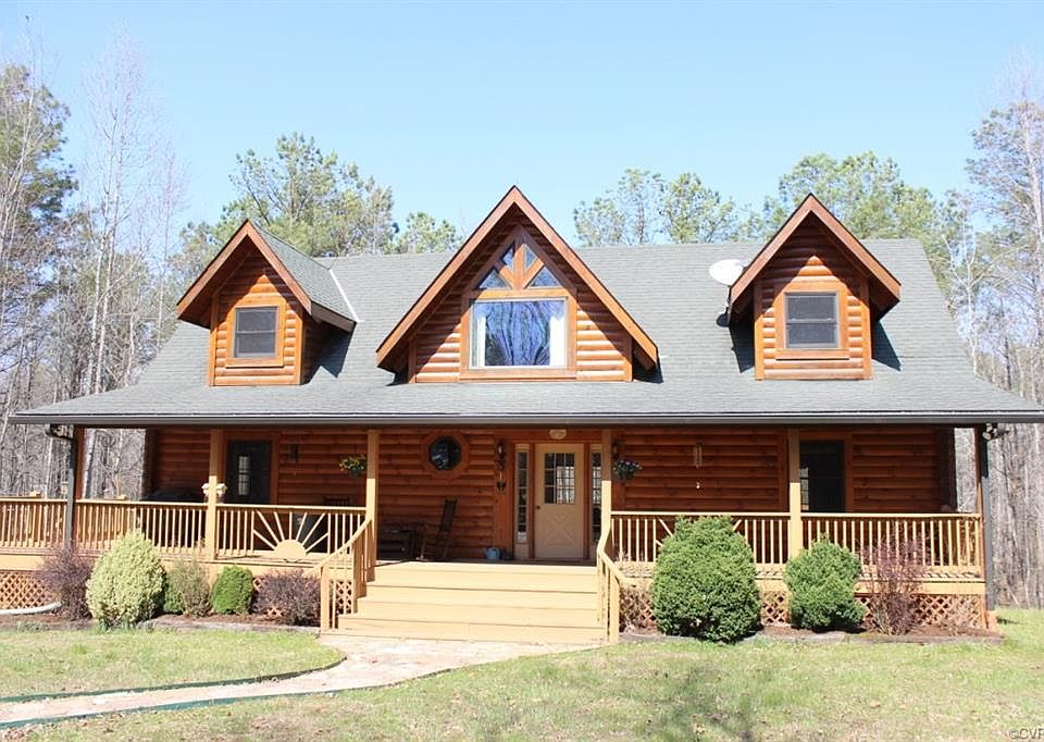 Pristine log home on 8.22 acres in Crozier tucked back in the woods. This well cared for home has a Full front porch that wraps around toa huge deck, the interior has Four full baths & one half, 1st floor owners suite, full finished walk-out basement and a must see great room with exposed beams in the cathedral ceiling. Upstairs are two bedroom with privates baths and loft.