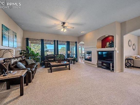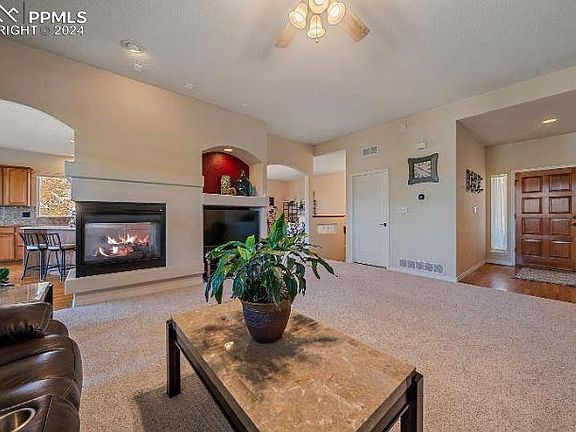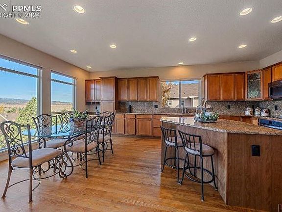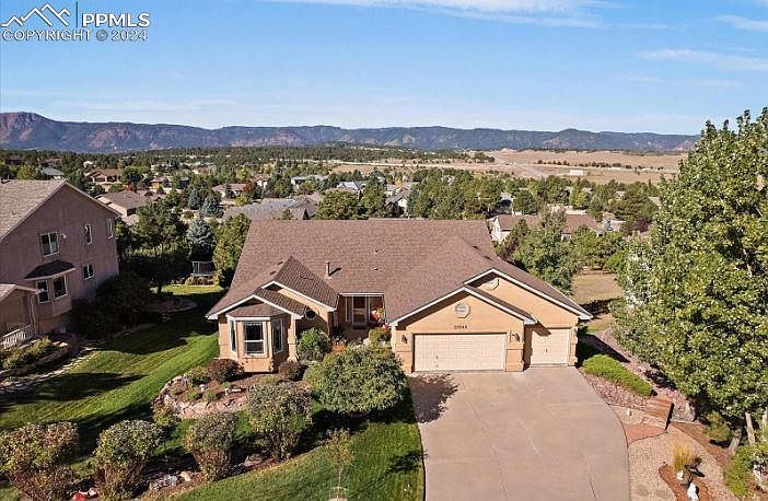 This meticulously cared-for 5-bedroom, 3-bath ranch with a 3-car garage offers a rare combination of elegance, comfort, and incredible mountain views. Enter through a recessed front door sheltered from the elements, stepping into a welcoming living room with a panoramic fireplace, visible from both the living room and eat-in kitchen. The kitchen is a chef’s dream, with hardwood floors, granite countertops, a spacious island with seating, with an undermount sink, ample cabinets, built-in desk, and a dining area, all with stunning mountain views. The primary suite features same stunning mountain views, a walk-in closet, sliding door to the covered deck, and an updated 5-piece ensuite with a standing tub and walk-in shower. Downstairs, the walkout basement includes two additional bedrooms (one with ensuite and walk-in closet), a full bar (stools included), pool table, built-in shelves in the TV area (surround sound included), a second fireplace, and access to a charming covered patio—all with beautiful mountain views. The large, fully fenced backyard is beautifully landscaped, it overlooks the neighborhood and the mountains beyond. Plygem windows, and the carpet replaced in May 2023 throughout the home. Smart Door bell, Garage door, thermostat, and sprinkler system included. Don’t miss the chance to own this stunning property, where every detail has been thoughtfully attended to.