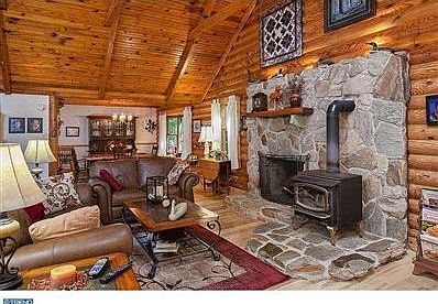A nature-lover's paradise. Total privacy yet close to everything. This custom-built log home exudes warmth and charm. Wooded setting on 5 acres, stunning views from all sides, front and side porch plus deck with koi pond. Two car garage connected at back of home. Home has been lovingly cared-for by one owner who was also a log home builder. Great room with massive stone fireplace and wood burning stove. Carpet removed and NEW hardwood floors laid.(no pink carpet) Large eat-in country kitchen with Island workspace, tile floor and corian counters opens to dining area. There are 3 bedrooms and 2 full baths on main floor and a fourth bedroom or office on upper level. Upper level loft could be enclosed to provide another bedroom. HVAC system 6 years old and windows are newer Pella brand. All rooms have tounge-n-groove wood ceilings w/exposed beams and custom wood trim. Solid wood doors throughout this one-of-a-kind home. You will look forward to coming home everyday! Full basement for all your storage needs.