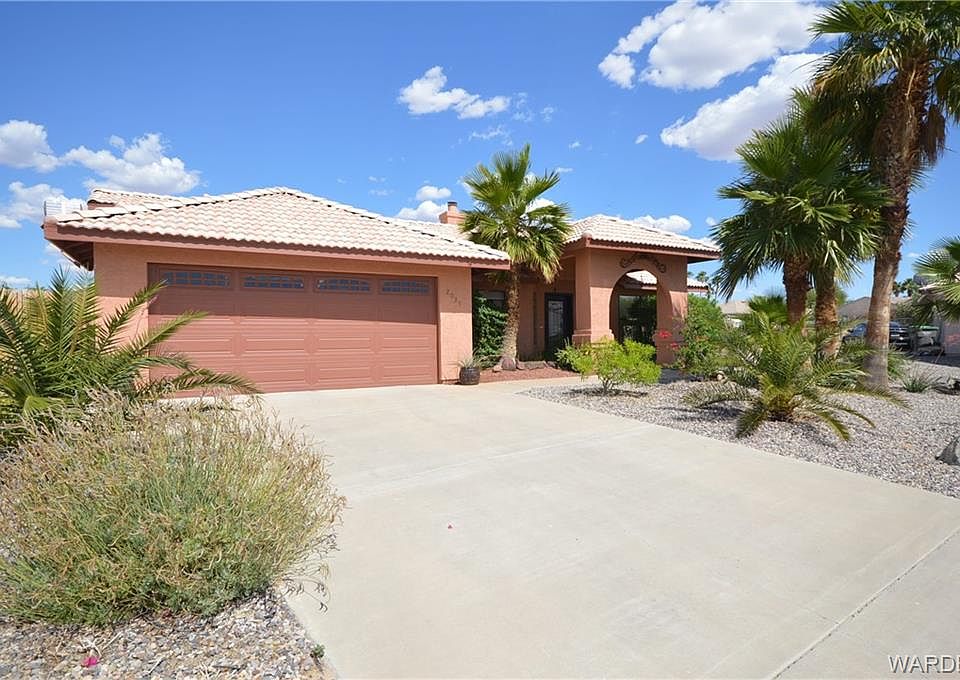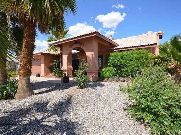Beautiful move in ready spacious 3 bed 2 bath, Spanish modern design, .25 acre, cul-de-sac lot. Mature shade trees & desert landscaping, irrigation system, hot tub/jetted spa. 7ft block privacy wall around the back yard with large covered patio & gorgeous water fountain brings a sense of peacefulness. Gated Boat and RV parking, 2 car garage, utility shed, garden area. Special features include vaulted ceilings, designer pot shelves, built in entertainment shelving, Corian countertops, split floor plan, gas fireplace. Enjoy relaxing views from a cozy den, just off the kitchen or from the back bedroom. All appliances stay, incl water softener. Septic tank installed July 2019. Community amenities include 2 refreshing pools, BBQ area & amazing mountain views! Close to casinos, shopping, medical, lakes & Colorado River.