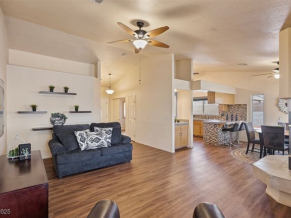Charming single-story townhome featuring 3 bedrooms, 2 bathrooms, and a 2 car garage in a well-kept community w/ pool, spa, guest parking, and BBQ/picnic area. Bright, open floor plan showcases luxury vinyl plank flooring, ceiling fans, and upgraded light fixtures throughout. The kitchen offers granite countertops, stainless steel appliances, a pantry, and a custom backsplash. Enjoy the two-way gas fireplace and elegant wood plantation shutters. Both bathrooms have been fully remodeled with quartz and stone countertops, new vanities, updated fixtures, and custom tile surrounds. Step outside to a private tiled courtyard with doggy door access. Additional highlights include a water softener system, new water heater, and low-maintenance landscaping, fully furnished and turnkey ready! Conveniently located near Downtown, the Strip, airport, shopping, restaurants, parks, and freeways. Assumable VA loan at 5.3% available (with VA/lender approval). Move-in ready schedule your showing today!
