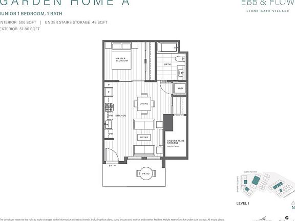 . Attention investors and first-time home buyers! Final home at Ebb & Flow! Located in the up-and-coming Lions Gate Village with easy access to Park Royal, Ambleside, Downtown Vancouver, and the Capilano River Regional Park. This bright 506 sqft Junior 1-Bedroom home includes parking & storage, and was designed by BYU interiors. The home features a high end Bosch appliance package, quartz countertops, high end laminate flooring with in floor radiant heating, sleek roll down blinds, and much more. Presentation Centre now closed, please call the sales team for more information