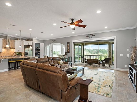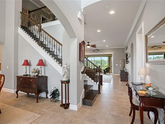 If a perfect house existed, it would be this. Spectacular tri-level lakefront home on 1.38 acres with expansive water views, sparkling screened pool, three floors of luxurious and functional living spaces including three family rooms, massive gourmet chef's kitchen, and motorized driveway gates - tucked in a quiet neighborhood with easy access to everything and home to the best schools in town. Welcome to the Best of Braemar: 2035 Lake Fischer Cove Lane. Enter this showcase residence to a formal dining and living room or den and take note of the soaring two-story ceilings. Past the foyer is a 23" x 20" great room that flows seamlessly into an entertainers' dream kitchen decked out with GE Monogram stainless appliances, gas cooktop with hood, stone backsplash, granite counters, island with sink and breakfast bar seating, breakfast nook bathed in natural sunlight, and a jaw-dropping Costco-sized walk-in pantry. A large screened balcony offers a front row view to the picturesque natural setting of Lake Hugh beyond. The main floor owners' retreat features a full sitting area with sliders to the balcony, 25-foot long bedroom, and a beautiful spa-like bath with separate tub and glass enclosed shower, double vanities, private toilet closet, and giant closet. Upstairs are three additional bedrooms - one ensuite, the other two connected by a Jack-and-Jill bath - plus second family room. Downstairs is a walk-out basement with 24" x 25" game room (third family room) and bedroom with full bath plus massive storage room. Enjoy direct access to the resort-style heated pool with heat pump and sun shelf, waterfall, and screen enclosure. Energy saving features include Low E windows, tankless hot water heater and 15 SEER rated Heat pump and A/C. Hurricane shutters on all sliding glass doors. Lake pump for irrigation. Truly a home that checks all the boxes!