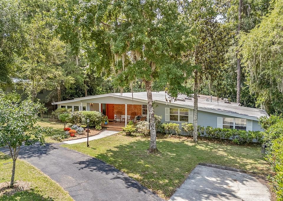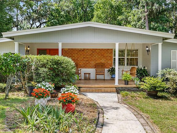Located just one mile north of the Ben Hill Griffin Stadium and the University of Florida, this Florida Park gem sits on .36 acres on a quiet street in the heart of Gainesville. A covered front porch with cracked tile floors welcomes you. Inside you will find a 4bd/3ba split floor plan, plus a cracked tile Florida room, family room, billiard room, an office/bonus room (formerly the original kitchen!), storage/laundry room, and a large eat-in kitchen with a wall of extra built-in cabinetry. The primary bedroom has an ensuite bathroom and French doors to a small deck leading to the backyard. There also are French doors off the kitchen that lead you to your beautiful backyard oasis. Outside you will find mature landscaping, two patios, a gas hookup for your grill, and a storage shed for your lawn equipment. Recent improvements include: new roof in 2021, new water heater in 2023, re-pipe in 2023, new AC in 2023, new windows in 2013 & 2023, insulation panels added to the ceiling in the Florida Room in 2023, insulation added to the attic in 2025, updated breakers in the electrical panel & a 30 amp RV connection added in 2023. There is a generator hookup in the back of the home to service the major appliances in case of a power outage, and a termite contract with Florida Pest for peace of mind. This well-maintained home is in pristine condition and ready for its new owner! Home is eloquently staged by Chic Staging and Design.