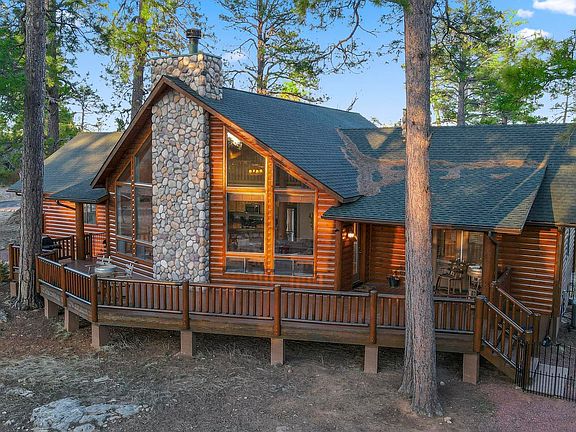 Live the ultimate mountain lifestyle in this amazing custom log home! Nestled in the gated community of Pine Canyon, this stunning 4 BR, 2 bath cabin lets you live your dream. Magnificent 2 story chalet windows, hardwood floors, and T & G ceilings. The spacious kitchen features granite counters, hickory cabinets, & s/s appliances,- the perfect place to whip up a great meal. After a day of adventure, retire to the luxurious master bedroom where you can relax in the Jacuzzi tub or warm shower. With 2 stone fireplaces you can cozy up w/a good book & enjoy the warmth of the fire. Enjoy the large decks & soak in breathtaking views of the heavily wooded pine lot, & maybe spot Elk roaming the area. Need more space? Lot to East Available for $50,000. There is also a 3000sf Click for More... Community clublhouse. What could be better? How about New AC 2021. Exterior stained 2021. New Water heater....2021. Come make this stunning cabin your own.