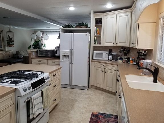 Mt. Shasta views from 2 private patios highlight this beautiful spacious remodel. Walls, windows, doors, floors, cabinets, bathrooms and exteriors, this has model home looks. Large livingroom, bright airy kitchen, Corian counters, Jennaire range, and island kitchen with seating for 4. Private backyard has 180 degree mountain views, timed sprinklers, lush greenery, large storage shed. Peaceful manicured senior park with golf access. Park has social activities, a poll & more.