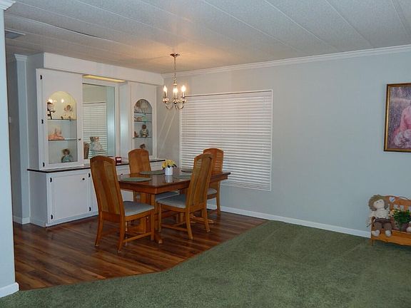 Beautiful double wide mobile home with a number of upgrades. Located on a nice corner lot with an intriguing entry to the home., not a typical look for a home in Senior mobile home park! Nice floor plan with a large living room with lots of windows, dining area, family room, and laundry room. Lovely covered front porch and covered parking in the rear, with a shed and a nice garden area. Don't let this one pass you by! Many items are sold with the home - refrigerators, washer, dryer, and microwave. Many other furniture items are also available for sale too! Great mobile home park for golfers too! Buyers must be park approved. The following are advert Park amenities: