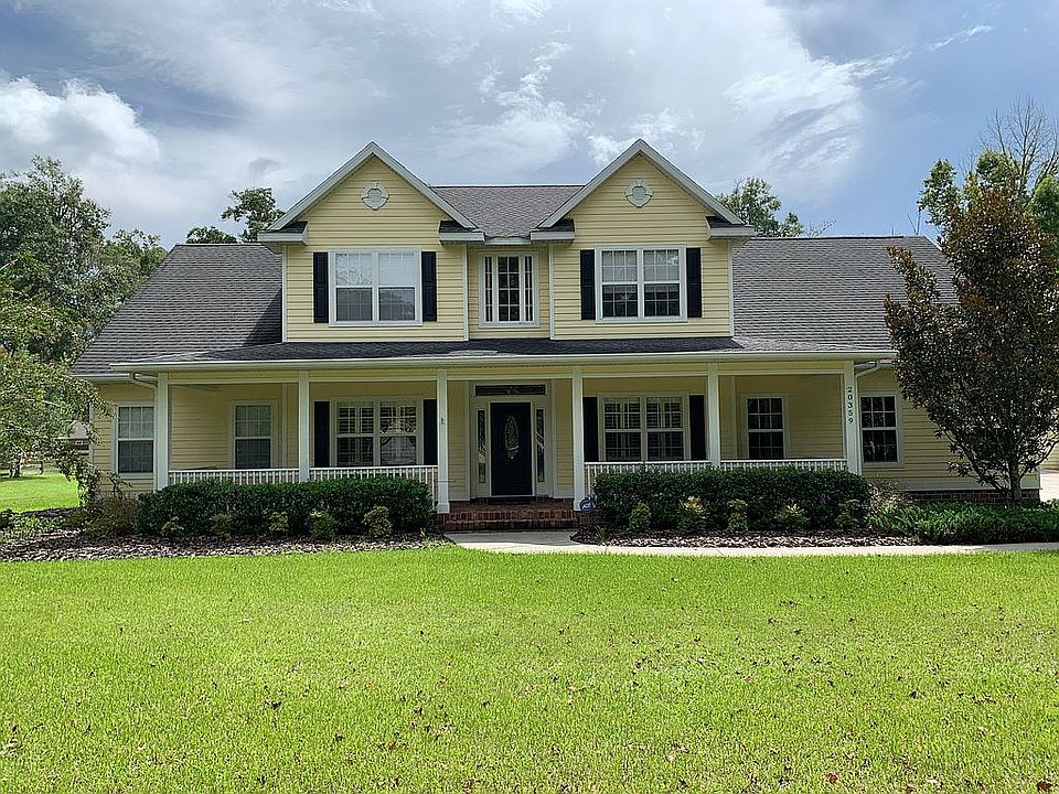 Beautiful two-story home located off a quiet cul-de-sac in River Run Plantation, one of the best neighborhoods in High Springs, walking distance to the Sante Fe river. Home sits on 1.8-acre lot with well-fed irrigation system and gorgeous, mature trees. Main living area with 20-foot ceilings and open stairway to the second floor. Large kitchen with granite counter tops. Formal living and dining areas. Master suite on the main level with dual walk in closets, separate shower and garden tub. Large laundry area with half bath. Upstairs you will find three additional bedrooms, two full baths and a bonus room that can serve as an additional bedroom. Ceiling fans in most rooms. Plantation shutters downstairs and custom shades in all bedrooms. Large covered, screened porch that leads out to large patio with fire pit. Oversized two car attached garage plus additional detached two car garage - both finished with plenty of power for a workshop. Home is wired for a generator making it a snap to power the critical portions of the home when the power is out. Two new Trane AC units (replaced in 2020) with four separate heating/cooling zones.