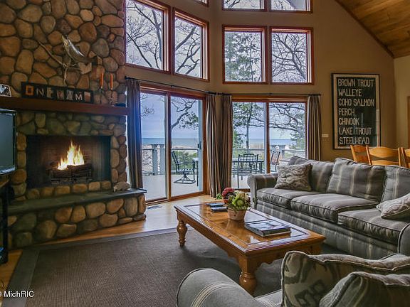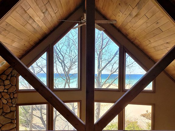 Beautiful, beachfront home on Lake Michigan with Portage Lake less than a block to the east. Watch sunrise over Portage Lake & sunset over Lake Michigan. This modern 7 bedroom, 3.5 bath home sits at the very end of the Portage Point Peninsula. Miles of fine sand beaches on Lake Michigan right in front of the home. Wooded dunes surround the north and east sides. No neighbors in sight creates a private setting. The beach is handicap accessible from the home. Boat slips available at the Portage Point Inn and Marina as well as beach club memberships allowing access to the pool and hot tub, located just a half mile away. Less than a block away is the Portage Lake Yacht Club with sunfish sailing lessons and a tennis court. A great investment and a high income generator as a vacation rental.