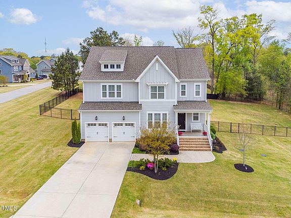 Elegant, yet relaxed home offers a blend of modern luxury and family-friendly comfort. The main level features a home office, gourmet kitchen with quartz countertops, a butler's pantry with a wine fridge, and a statement fireplace. With 4 bedrooms, 4 bathrooms, and spacious living space, this home provides ample room for relaxation and entertainment. Upgrades include a Sonos sound system and a bonus room. Amazing Primary Suite! The .82-acre lot offers space for outdoor activities and a pool. Enjoy the tranquility of the neighborhood, surrounded by trees and a community lake, while still being close to shopping and amenities. Whether unwinding on the screen porch or exploring the local community, this home provides the perfect balance of relaxation and convenience. Less than 20 minutes to the heart of downtown Raleigh. 5 minutes to the new Costco, groceries & dining.
