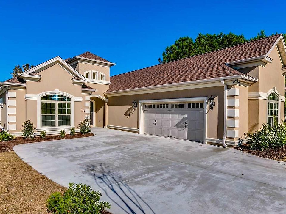 First photos are of the current state of construction and the remaining photos are of another home with the same floor plan already built and sold. This is a beautiful single level Mediterranean home to be built on the pond in The Bluffs on the Waterway in the Carolina Forest area of Myrtle Beach! This home would be perfect for someone who needs four bedrooms and an office and does not like stairs. The home will have a very open floor plan with a dining area, family room with fireplace & custom built-ins, kitchen with island bar, with beautiful tile flooring in all wet areas, and crown molding throughout the main living areas and master bedroom. The main living areas will feature wide plank hand-scraped hardwood flooring, with carpet in the bedrooms. The kitchen features custom cabinetry, granite countertops, gas cook top, vent hood, and stainless steel appliances. Also featured is a large laundry area, spacious master suite with a pond view, his and hers split walk-in closet, and spacious bath, featuring double sinks with a granite countertop, garden tub, and large tiled shower. The dining area, kitchen, family room, and master bedroom all feature multi-trayed or coffered ceilings. There are three guest bedrooms (one with it's own bathroom), and an office with French doors. The garage is oversized with a courtyard entry for easy access, and the water heater is a tankless gas powered model. The exterior features a stucco finish, beautiful landscaping, and a large covered lanai with views to the serene pond and fountain. The driveway features a salt finish. The Bluffs on the Waterway is a gated custom home community with wonderful amenities, and is located on the Intracoastal Waterway. This home is starting construction May 2015, with an estimated completion date of October 2015. If you go under contract early, you can make selections and/or upgrades to customize this home!