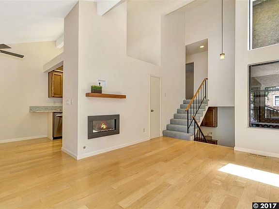Bright end-unit townhouse with dramatic vaulted ceilings! Located on Mtz/PH border adjacent to Hidden Lakes Park. Upgraded with hardwood floors, granite kitchen counters, updated bathrooms including newly redone upstairs bathroom, gas fireplace. Two bedrooms have walk-in closets. Central A/C, attached garage, laundry hookups. Inviting fenced rear yard with no rear neighbor in addition to front patio balcony. Very Sharp!