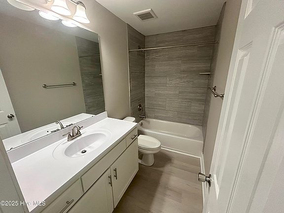 Completely updated two bedroom first floor condo! Upon entering you will enjoy the brand new finishings which include vinyl plank flooring, new paint with white trim and new light fixtures through out. The entry foyer has a coat closet. The open living room with sliding glass door that leads to a long patio and flows into the separate dining area. The newly upgraded kitchen features white cabinets, granite countertops, stainless appliances which makes this space inviting. Stackable washer and dryer in hallway leading to the bedrooms. Each bedroom has a large window and lots of closet space. The upgraded bathroom has a tile surround tub, new vanity and tile flooring. Private storage closet at end of deck is perfect for beach gear or bikes. Water and sewer fee included in rent. Great location with easy access to Wilmington, Topsail Island beaches and Camp Lejeune. NO smoking Application fee applies NO pets North Topsail Elementary Surf City Middle Topsail High
