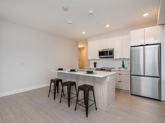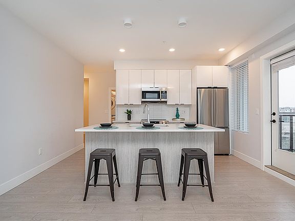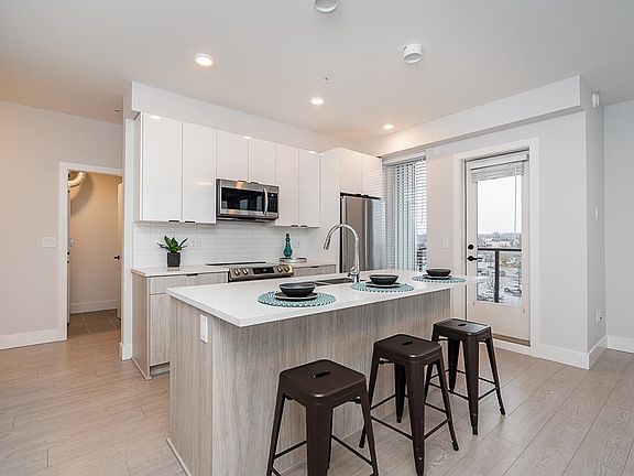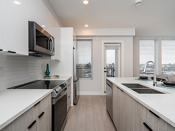 Prime location and immaculate condition! This bright 2-bedroom, 2-bathroom corner unit at Genesis is a commuter’s dream. The home features extra windows for natural light, a spacious kitchen with S/S appliances, large island/eating bar, and a functional dining/desk nook. Bedrooms are well-sized with ample storage. Enjoy the gym, amenity room, and lush garden area complete with a putting green. Unbeatable walkability to shops, breweries, and restaurants. With the Skytrain expansion arriving soon, this is a fantastic opportunity to buy into a growing neighborhood. Comes with 2 parking spots and a storage locker. Your strata fees include hot water.