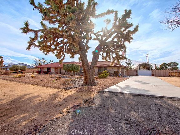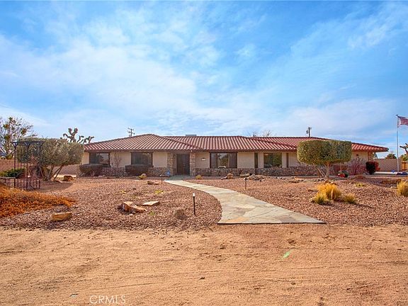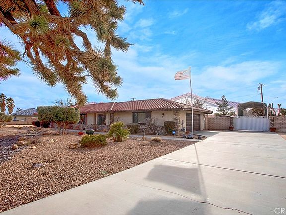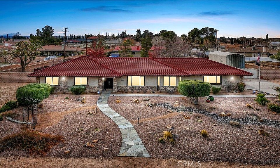 This sprawling home is located in a desirable Apple Valley Sunset Hills neighborhood and just gets better everywhere you look. On a huge, nearly ¾ acre lot, this move-in ready open floorplan features 2,296 sq.ft, vaulted ceilings, recessed lighting, gorgeous flooring, huge stacked stone fireplace, faux wood blinds, formal living & spacious family room to accommodate large furniture. Formal dining & sunny breakfast nook offer bay windows. You’ll be delighted to prepare meals in this gourmet kitchen with custom maple cabinetry, gorgeous granite countertops, large island and coffee bar. Stainless Viking 6 burner commercial gas stove & double built-in ovens include a warming/steam drawer. Indoor laundry with backyard access, 3 oversized bedrooms & owner’s suite with private access to the backyard and private hot tub, ensuite bath, makeup vanity & double sinks and a luxurious walk-in shower. Water-saving landscape front & rear, block walls for privacy, a huge covered patio, large storage shed, hot tub with privacy fence & fountain & just enough grass for a park-like feel. Protect your RV in the 12x37x13 steel RV carport with rolling steel gate, cement pad & electric hookups. Solar is paid in full and available to transfer. You will look forward to coming home to relax in the spa or enjoy cool summer nights on the patio of this lovely home..