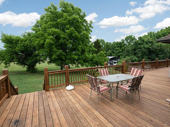 Finished walk-out basement home with lots of new updates. This spacious 5-bedroom home has 3 plus living areas, formal dining room, finished walk-out basement, 3 full bathrooms, John Deere room, and a 3-car garage. The home is in the Nixa school district and conveniently located between Springfield & Nixa in River Downs Subdivision! New updates August 2020 include kitchen granite counter-tops, granite desk counter-top, subway tile back-splash, freestanding oven/range, under-mount sink, some freshly painted rooms, and master bathroom ceramic tile. Additional updates include a new roof (June 2020), new John Deere room exterior doors, refinished hardwood flooring in kitchen and foyer, new exterior lighting, and freshly stained deck, and within the past 3-5 years updates include kitchen dishwasher, carpeting on stairway and the basement living areas, furnace, and water heater. You will appreciate the spacious kitchen and kitchen/dining area, pantry cabinet, built-in desk, breakfast bar, kitchen cabinet mantle for display, abundant countertop space and cabinets. The master bedroom is large and has a raised ceiling treatment, a master bathroom ensuite with corner jetted tub, walk-in shower, and a spacious walk-in closet with built-in shelving. The living room features a brick fireplace hearth with wood mantle, high ceilings, and access to the backyard deck. Other features to appreciate include a downstairs recreation room with wet bar & tile flooring, downstairs family room with carpet flooring, six panel solid wood doors, lots of available storage, attic fan, water softener, backyard deck access from both the kitchen and living room, outdoor wood heat back-up, huge backyard deck, spacious landscaped yard with water feature, and the brick/stone and vinyl exterior make this home nearly maintenance free. Schedule your showing today!