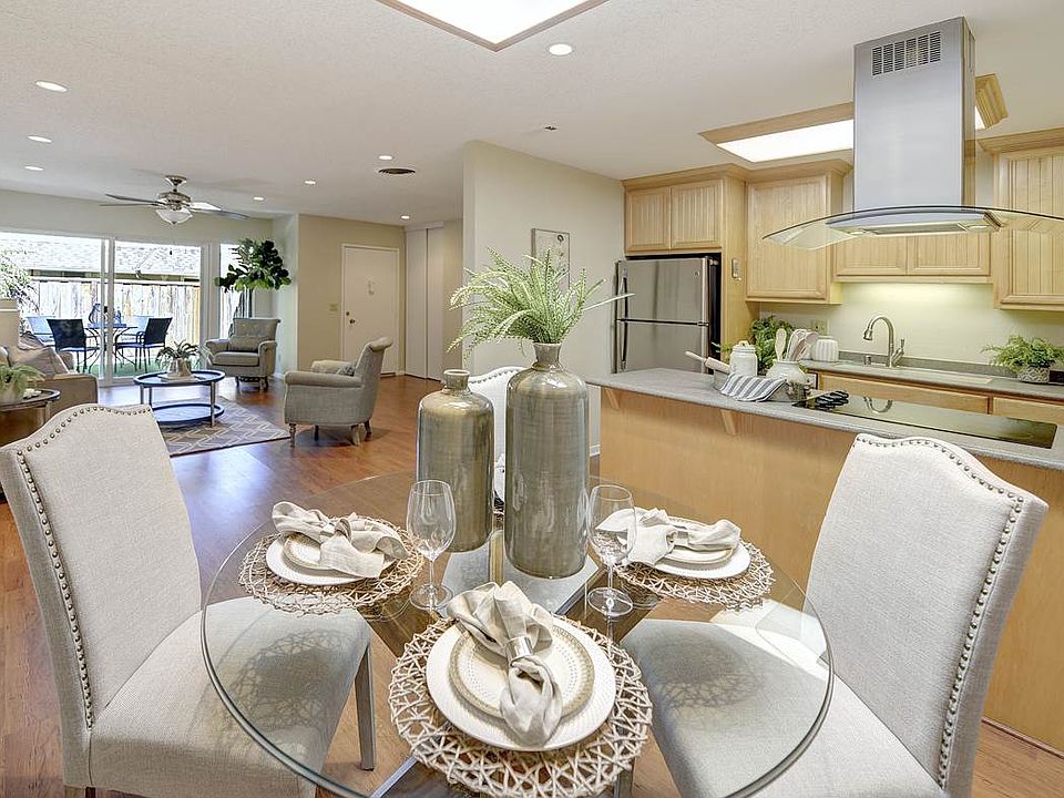 You are greeted by a large grass area as you approach this single story 3-bedroom 2 bath Condominium. It offers the convenience of no steps and is truly handicap accessible with only a short walk to the carport. This property is appointed with new two-tone designer paint, new upgraded carpet and cherry laminate flooring. The kitchen was updated several years ago with custom maple cabinets, Corian countertops and stainless-steel appliances including dishwasher, electric range/cooktop, microwave & refrigerator. The newly painted two-tone designer color scheme is enhanced with large skylights in the dining area and bathrooms, added can lighting in the living room, updated light fixtures and comfort height toilets in both bathrooms. You can walk out onto your private fenced in patio through the large dual pane sliding door in the living room. There are ceiling fans in the living room, and two bedrooms for your added comfort. A full-sized Washer/Dryer are included for your convenience.