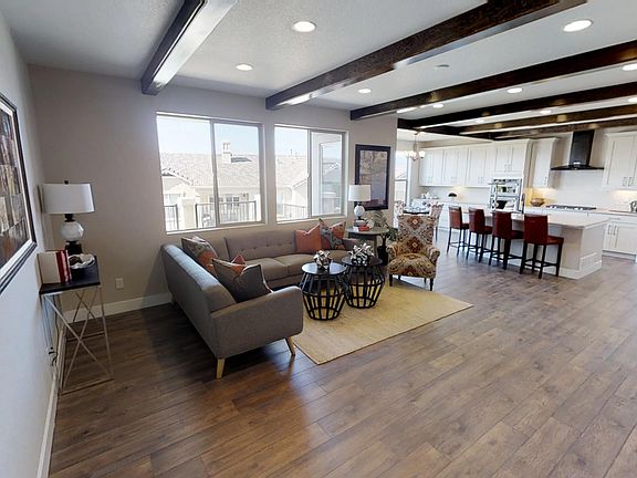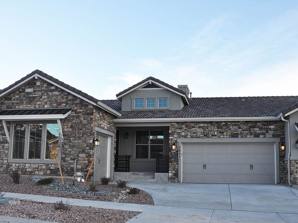 Ready now! San Isabel paired patio ranch plan with 3 car garage in The Village of Cortona at Flying Horse. 4 bedrooms plus Study, 4.5 bath home with garden-level basement. Kitchen features antique white cabinets w/chocolate glaze, quartz counters and stainless steel appliances with gas cooktop. Barn door at master. Oil rubbed bronze hardware. 2 gas fireplaces and air conditioning. Finished basement includes 1ft. taller ceilings, wet bar, 2 bedrooms, 2 bathrooms and rec room. Exterior deck with gas line.