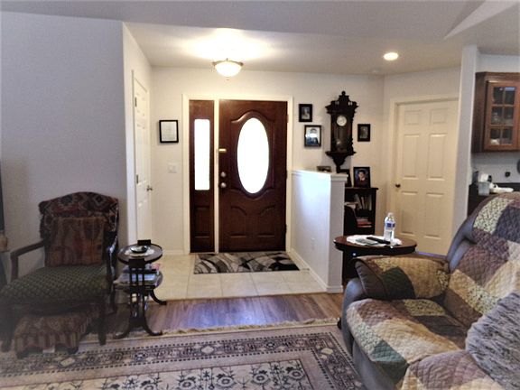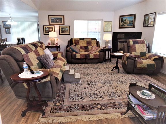 The long concrete driveway lined with hedges leads to this very well taken care of home tuck in the back of a cul-de-sac. The front door opens to the large living room, kitchen, and dining area. Harwood cabinets with slow close hardware line the kitchen walls and granite covers the counter tops. All of the appliances are stainless, and the new range top is gas, as is the fireplace in the living room. The flooring is all new: laminat plank, carpet, and plywood subflooring. All bathrooms have been remodeled with new fixtures, plumbing, & marble shower enclosures. Built in shelving in closets throughout. The primary bedroom has a walk-in closet, bathroom with dual vanity, walk-in Shower, & Step Saver jetted walk-in bath. Beautiful landscaping front & back. And concrete patios off of living room and primary suite.. Smaller backyard has plush grass and completely fence (new gates and fencing). Beyond the fence is a great walking path. This is a very nice home!