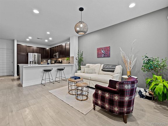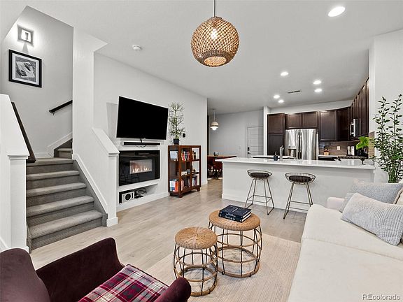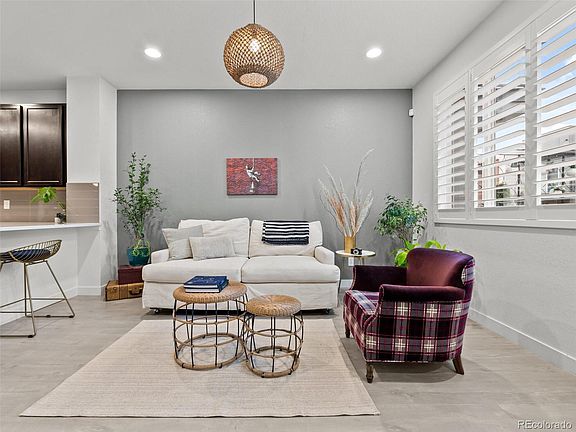 This upgraded, immaculately kept Midtown townhouse is move-in ready and perfect for anyone looking for easy living. The main floor boasts an open floor plan, 9-foot ceilings, custom lighting, custom plantation shutters, a large cook's kitchen with tons of storage, stainless steel appliances, quartz countertops, dining room, and a powder bath. The home offers two generously sized bedrooms with ensuite baths, large windows, and walk-in closets. The primary includes a 5-piece bathroom and the guestroom doubles as an office with a custom built-in Murphy bed and desk. The laundry closet with included washer/dryer is conveniently located on the upper level between the bedrooms. Enjoy having a two-car attached garage with additional storage. Smart locks are installed on both the front and back doors and connected to an optional security system. The front patio is perfect for basking in the Colorado sunshine! Midtown is 5 miles North of Downtown Denver and situated between two light rail stations with access to the G and B lines. Community amenities include a 21-mile Clear Creek Bike Path west into the town of Golden or east, which connects to the Platte River Trail and downtown. Community garden and large park, along with a dog park at the west end of the community! Enjoy the Denver hot spots, including Linger, Root Down, and neighborhood Brewery Bruz Beers! Easy access to Boulder via Highway 36 and the mountains through I-70!