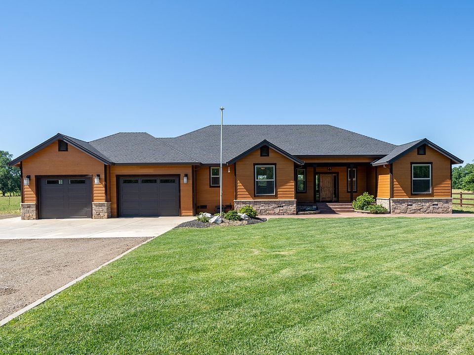 Looking for Privacy in the country not too far out? This Is a split bedroom plan. 3 bedroom plus an office. Beautiful kitchen with granite slab counter tops, 6 burner stove. living room with vaulted wood ceilings. Wood floors through most of the house. 2 bedrooms have carpet. Master has double sinks ,big soaking bathtub, walk in closet. Covered back patio. 2 inch ag meter from BV water, owned solar, a 35x35 garage/shop with covered storage in back of garage. fenced and cross fenced! Beautiful property. Private gated road!