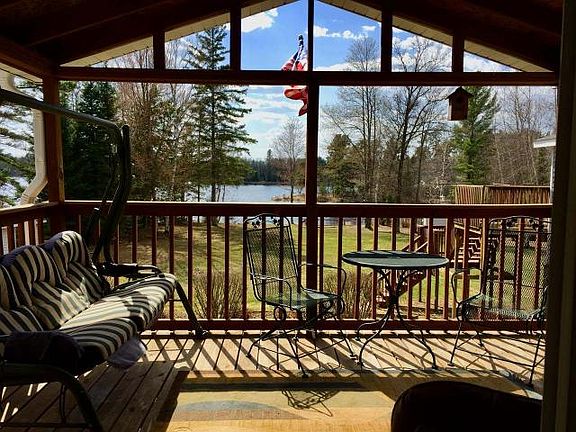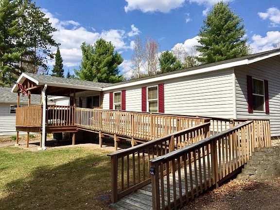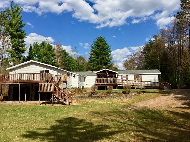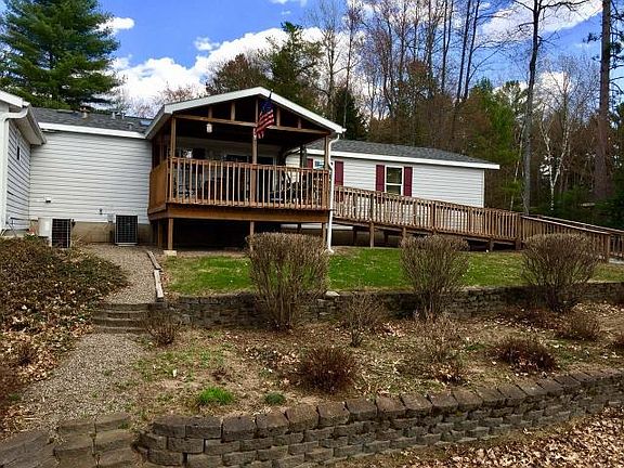 2 HOMES FOR THE PRICE OF 1! Here you will find 2 homes situated on 1.67 acres & 125' of level frontage. The main home has 4BR, 2BA, spacious living quarters, laundry, & lakeside deck. The 2nd home consists of 1 master BR w/ensuite, spacious living qrtrs, laundry, & lakeside deck. You can live in one home & keep the other for your overnight guests or rent it out for add'l revenue. Underneath the 2nd home there is add'l garage space w/ 2 overhead doors w/ enough space to store boats, RV, snowmobiles, etc. In addition there is a 3 car att'd garage which connects to both homes. Each home has its own forced air A/C & is furnished with its own appliances. This yard was meant for entertaining, huge lakeside deck, level yard for volleyball, bonfire pit w/ wood storage shed, & another outbuilding for toys. Enjoy your western sunset views overlooking undeveloped land. You are centrally located in the heart of the ATV/snowmobile trail system and just a boat ride away from many restaurants/bars