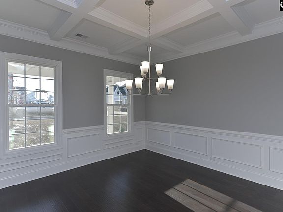 This Cushing II plan is an ideal family home with 4 bedrooms, 2.5 baths, and a three car garage. Five inch plank hardwood flooring is included in the entire downstairs and the upstairs hallway. The dining room features a coffered ceiling, two piece chair rail, and judges panels. A beautiful open oak staircase leads to 4 spacious bedrooms, each with a walk-in closet, and a huge bonus room. The primary bedroom suite features an elegant bathroom with a corner garden tub, separate tile shower, and dual walk-in closets. A third car garage, ten foot ceilings downstairs, and a covered back porch are included. This home has many designer touches including heavy trim, upgraded painted cabinets, ceramic tile flooring in baths and laundry, window blinds, and quartz and granite countertops throughout.
