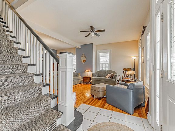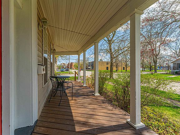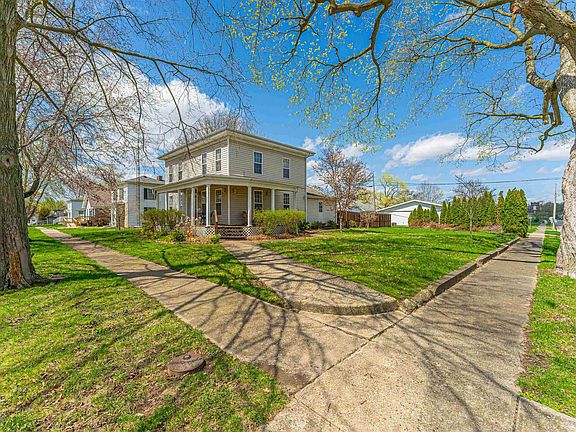 Talk about curb appeal! This beautiful vinyl sided 4-bedroom, 2 full bath corner lot residential dwelling offers abundant curb appeal paired with a warm inviting interior that welcomes you and yours to come on home to choice small town living! Step inside and prepare to fall in love with the bright and airy open living/dining concept that is host to great natural light, rustic wood flooring, fantastic floor space, and an open staircase, an equipped tiled eat-in kitchen with uniquely designed high ceilings, 5X15 enclosed side porch, convenient tiled laundry room area, large full hall bath, and a roomy front facing bedroom (could be used as a den/office if needed) with hardwood flooring. Upstairs, you will find three additional bedrooms -- two with hardwood flooring -- and a large full hall tiled bath with a corner shower. Property also features a large basement, vinyl replacement windows, newer architectural roof, wrap around front porch, and a privacy fenced backyard host to a patio with a pergola in addition to a storage shed. Conveniently situated within walking distance of the historic downtown district, this lovely spacious residential dwelling awaits new ownership!