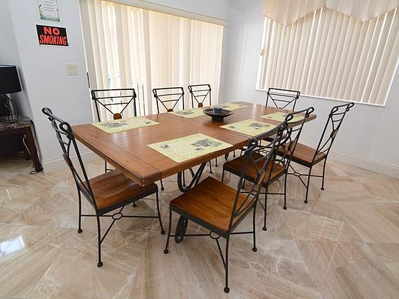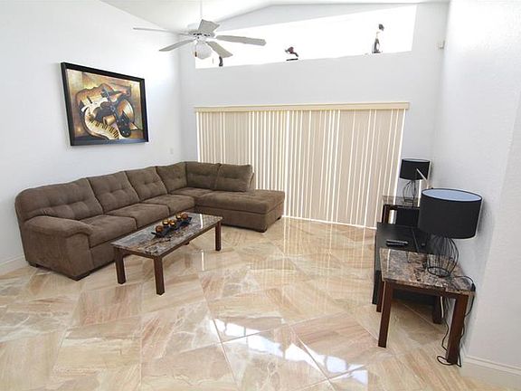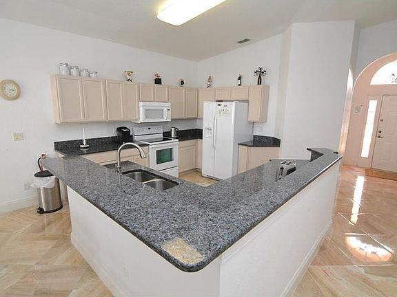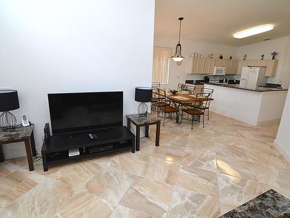 4 bedroom 3 bathroom fully furnished home located in Ashley Manor. Brightly lit home with upgrades throughout such as new marble flooring and granite countertops in the open kitchen. Large sliding glass doors lead to the enclosed pool area from both the master bedroom and family room. An additional guest bedroom with ensuite bathroom can be found at the front of the home. Off the back of the home is the private screened-in pool and fully fenced yard. The home makes a fantastic vacation home or full time residence. Located in Ashley Manor just 15 minutes away from Disney!
