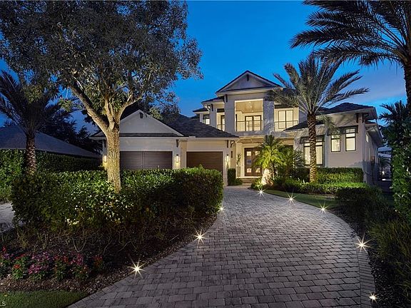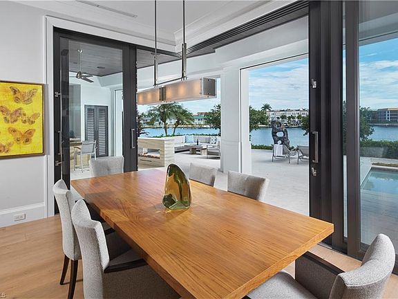 Sprawling on over 160ft of water frontage this transitional, custom, Coleman home is what your Naples dreams are made of. Expertly detailed by Lisa Ficcara design, the interior finishes are stunning while floor to ceiling 10ft sliders line the back to provide bay views from nearly every room. The custom Ruffino kitchen offers 2 center islands, double Wolfe ovens, Miele coffee maker, commercial grade refrigerator/freezer all completed with striking Quartzite countertops. Wine enthusiasts will appreciate the wine room complete with aSommelier wine system. The luxurious master suite offers a soothing space to unwind and includes a quaint seating area to take in the view, separate exercise room and well-built out, generous closet. Inclusive of nearly 1,500 sqft with full summer kitchen, ventless two-sided fireplace and tiered to have both covered and uncovered space, this house is all about outdoor living, conveniently detailed with electric roll down screens and shutters. At sunset enjoy the outdoor firepit or relax on the spacious and luxurious boat dock, complete with ambient lighting, boat lift and platform lift. All of this and more, ideally in the heart of the Moorings.